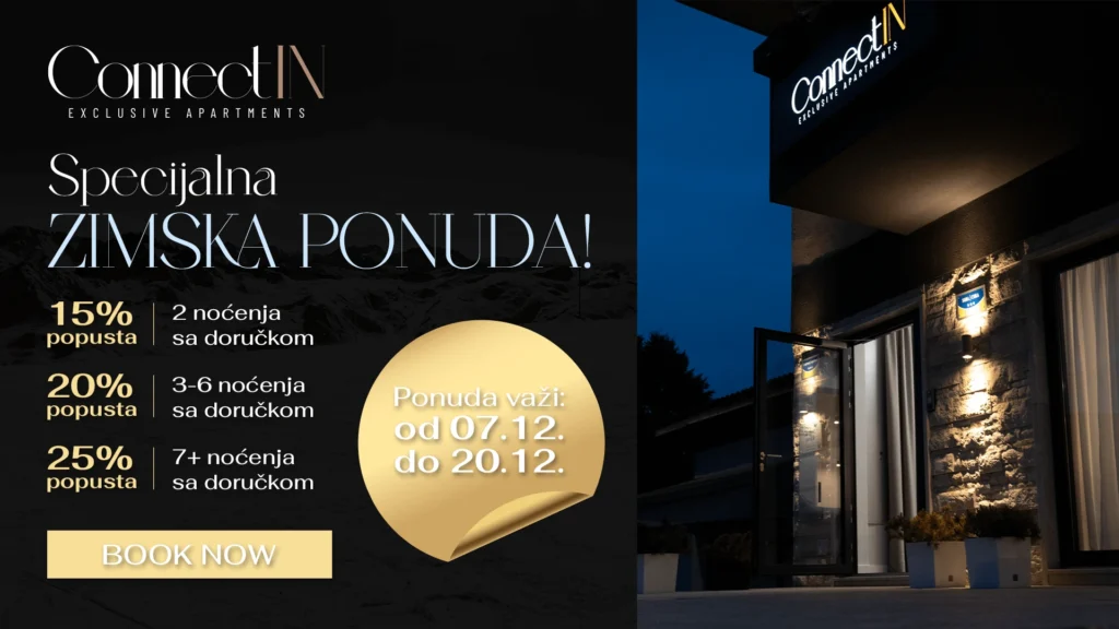 Zagrlite zimsku sezonu sa stilom u ConnectIn. Ostvarite 15% popusta na boravak od 2 noći, 20% popusta na 3-6 noći, i 25% popusta na 7 i više noći. Prepustite se luksuzu i udobnosti sa našim posebnim zimskim popustima. Rezervišite svoj boravak danas!